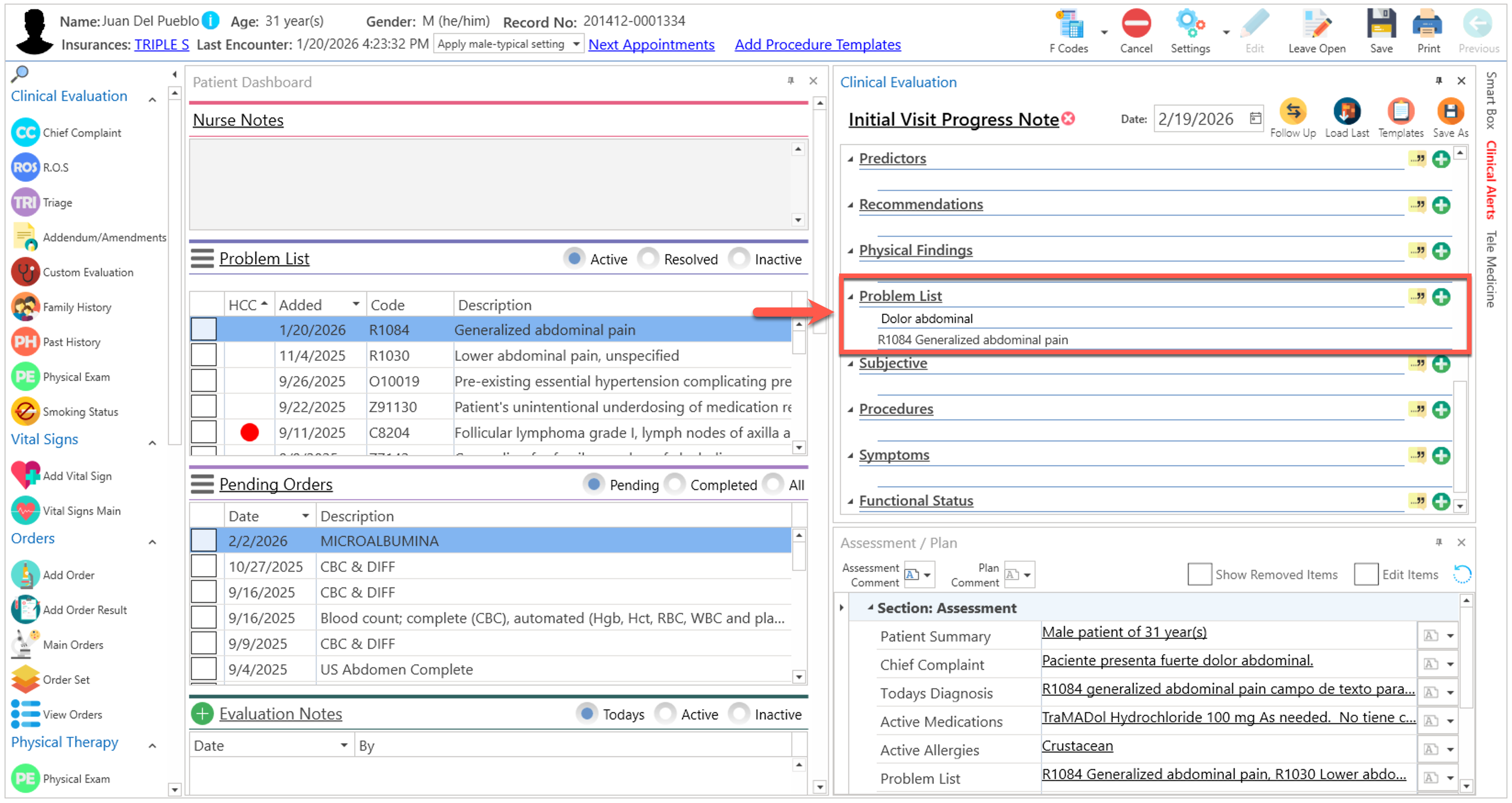 - El/los diagnósticos seleccionados, pasarán a la sección de "Problem List", en la evaluación clínica y a su vez, al historial del paciente.