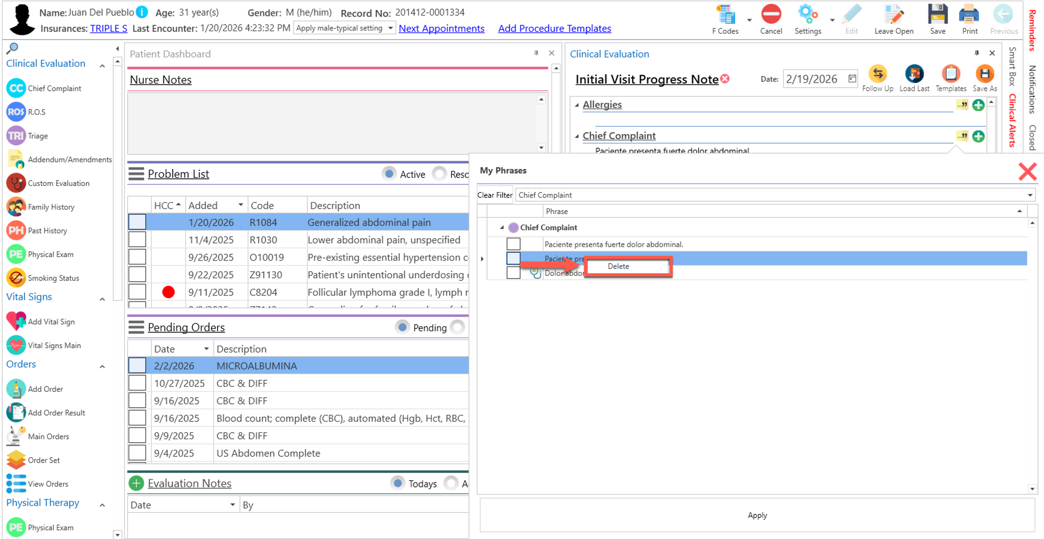 - Ahora se podrán eliminar las frases directamente desde la sección de evaluación clínica, simplemente seleccionándolas y haciendo clic derecho con el "mouse".